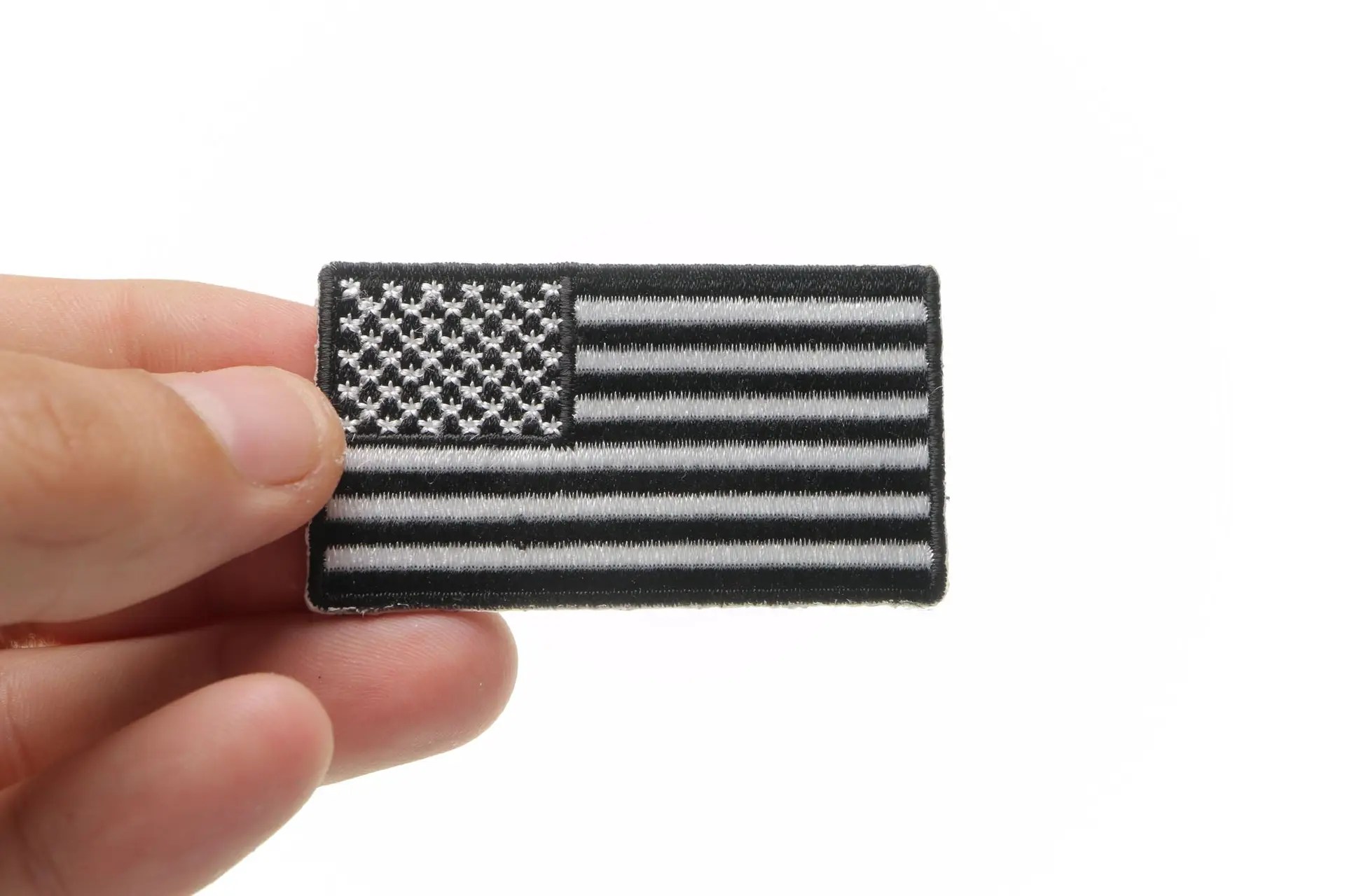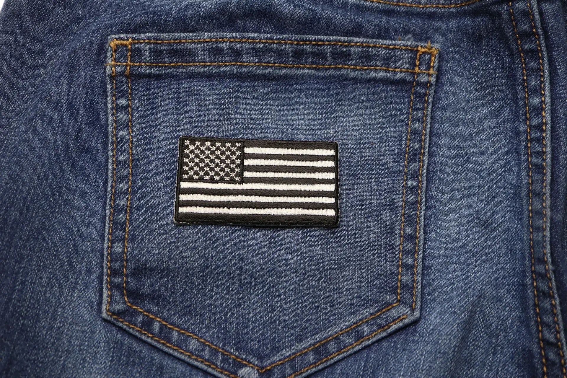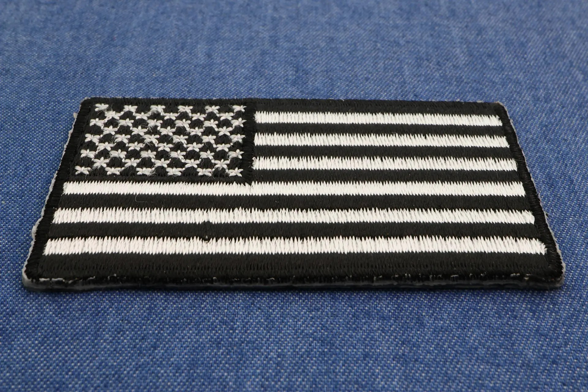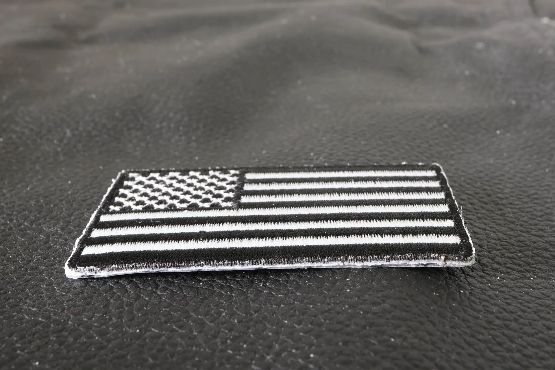 US Flag Patch Black and White 2.5 inch measures 2.5×1.4 inches and is Embroidered in Black / White. The Small Patch can be sewn on or ironed on to clothing such as Denim or Leather Jackets, Vests, Hats, Back Packs, Shirts. Features plastic backing and embroidered die cut borders.